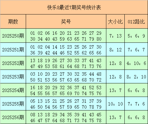 快乐8第2025256期奖号为:08 13 18 29 34 35 39 41 43 45 46 47 57 64 68 71 73 74 75 78,其中奖号012路比为6:6:8,大小比为13:7。