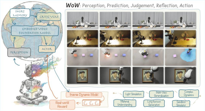 WoW 是一个融合了感知、预测、判断、反思与行动五个环节的具身世界模型。它从真实的机器人交互数据中学习,能在已知与未知场景中生成高质量、物理一致的机器人视频,最终让想象中的动作真正落地于现实执行