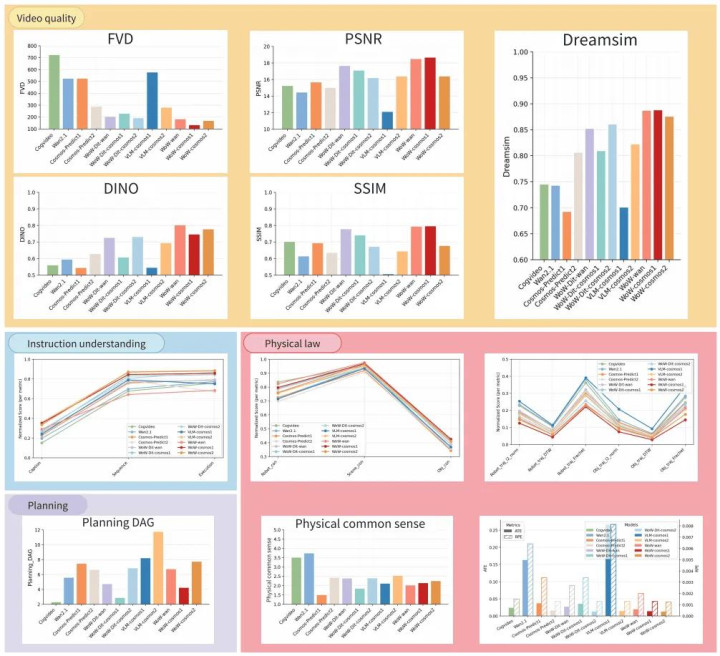 没有评估,就没有科学。团队提出了 WoWBench —— 全球首个针对具身世界模型的综合基准。它包含 近千个高质量交互样本,覆盖 4 大核心维度,感知理解,预测推理,决策与规划,泛化执行。WoWBench 的评估角度覆盖多个指标,包括视觉保真与时间一致性,掩码引导的区域一致性,指令理解与语义正确性,物理与因果推理,规划与任务分解。