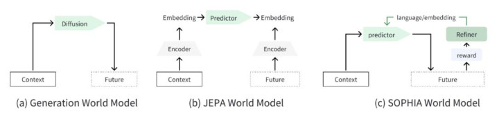 比较了三种框架的核心机制:(a) Diffusion 模型:从输入上下文生成未来帧;(b) JEPA 模型:学习在嵌入空间中的预测一致性;(c) SOPHIA: 首先由 预测器从上下文生成未来;接着由 评估器对结果进行打分,产生奖励信号;然后由 修正器基于奖励和外部语言 / 嵌入反馈发出纠正信号;整个系统通过这种方式进行循环优化。