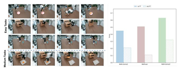 WoW 在真实机器人环境中的有效性。(左) 展示了 WoW 在真实机器人上执行的简单与中等难度任务的成功轨迹示例。 (右)展示三种不同世界模型骨干在现实世界准确性比较的定量结果。在所有基础模型中,微调都极大地提高了现实世界中的性能,其中 WoW-cosmos2 达到了 最高得分,展现了最优的实际执行能力。