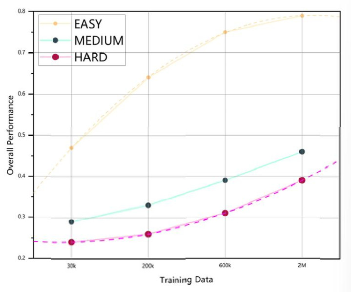 此节阐述了 WoW 在具身智能领域对神经网络 Scaling Law 规律的探索结果。在数据与模型均扩大的情况下,性能呈单调上升但逐渐饱和,这与 GPT 系列、Diffusion 模型的经验一致,说明其架构稳定且具备扩展潜力。实验主要针对三个核心变量,数据规模、任务难度、模型规模等。 结果表明总体性能遵循典型幂律关系。其中性能最大收益出现在从 200k → 600k 的扩展中。任务难度消融实验说明模型在中等和困难任务中尚未饱和,更多对应类型数据可进一步提升性能。此外,在不同尺寸模型中 14B 模型性能最强但推理最慢,7B 模型在性能与效率间更平衡。