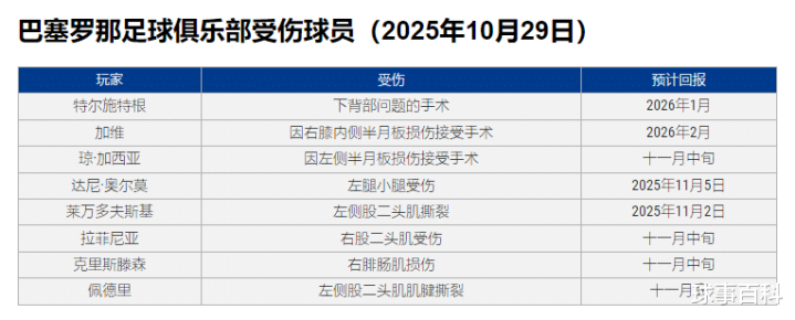 巴萨遭重创! 中场大核伤停3周 伤病名单聚齐6大主力