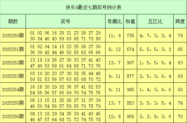 福彩快乐8第2025256期开出奖号:08 13 18 29 34 35 39 41 43 45 46 47 57 64 68 71 73 74 75 78,其中奖号奇偶比为12:8,和值为958,跨度70,五区比为2:2:8:2:6。