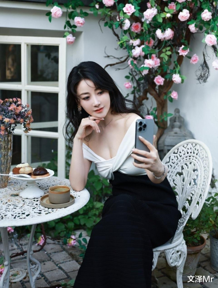 左手托腮的慵懒姿态,背后白色建筑与粉色蔷薇的浪漫背景,桌上精致点心和插花细节,共同构建了一个充满故事感的午后时光。这组照片证明:同一件衣服在不同场景、不同姿态下,能够传达截然不同的情绪与氛围。