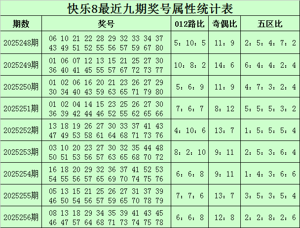 福彩快乐8第2025256期奖号为:08 13 18 29 34 35 39 41 43 45 46 47 57 64 68 71 73 74 75 78,其中奖号012路比为6:6:8,奇偶比比为12:8,大小比为13:7,五区比为2:2:8:2:6。