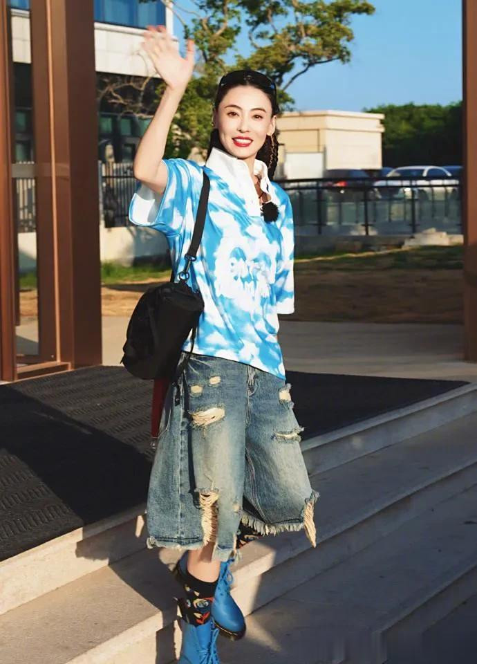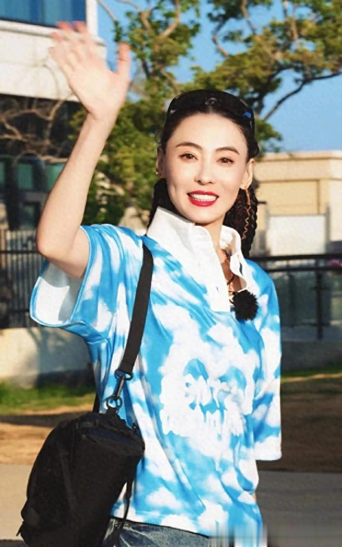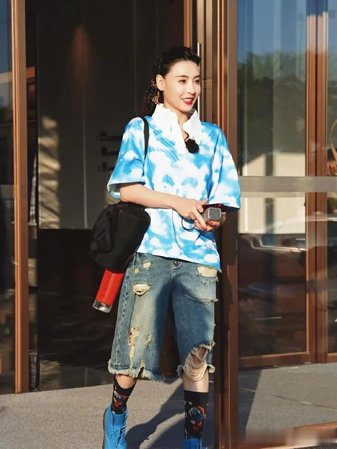 张柏芝越活越年轻! 蓝色翻领衫+牛仔五分裤, 减龄又高级!